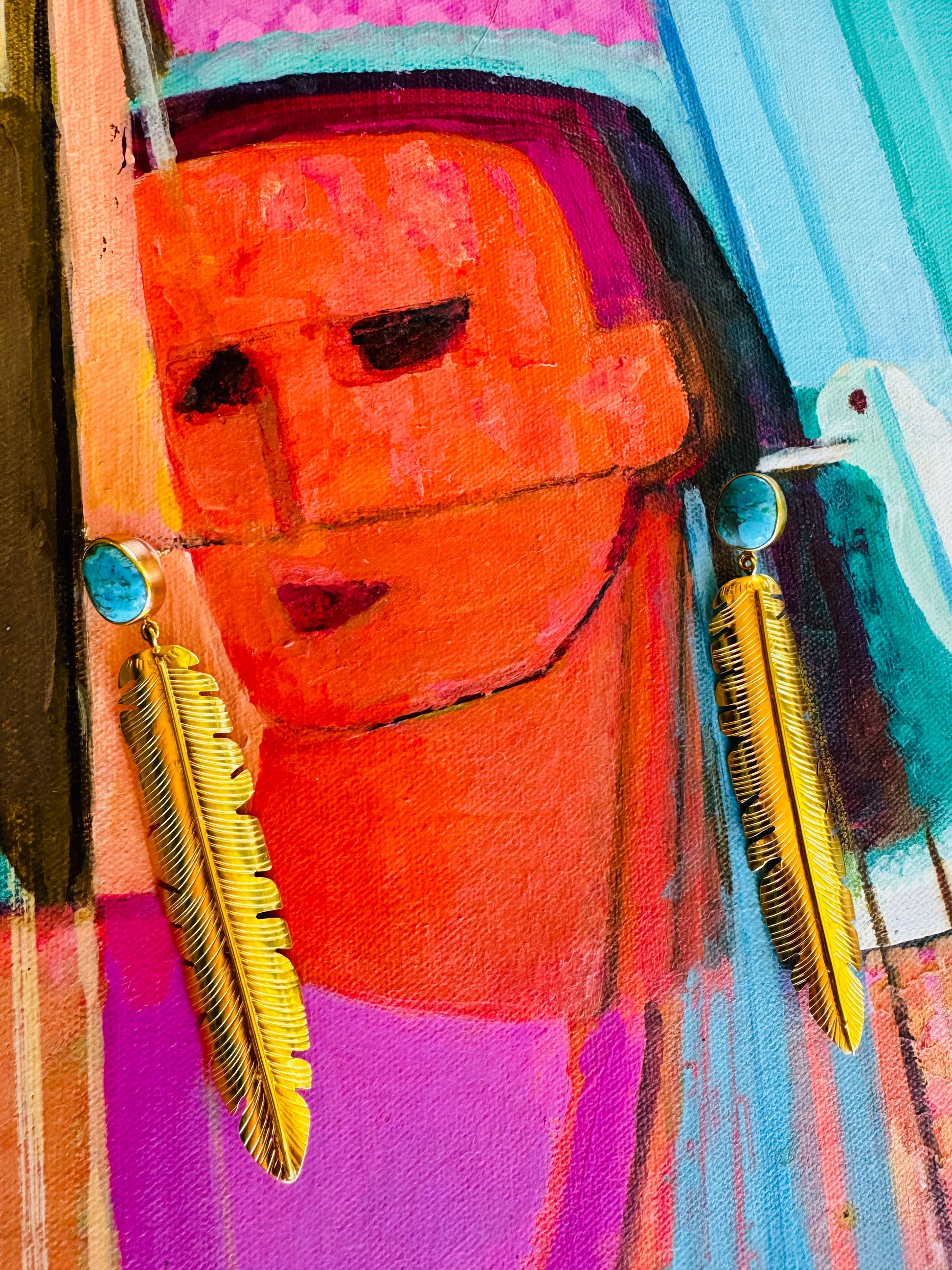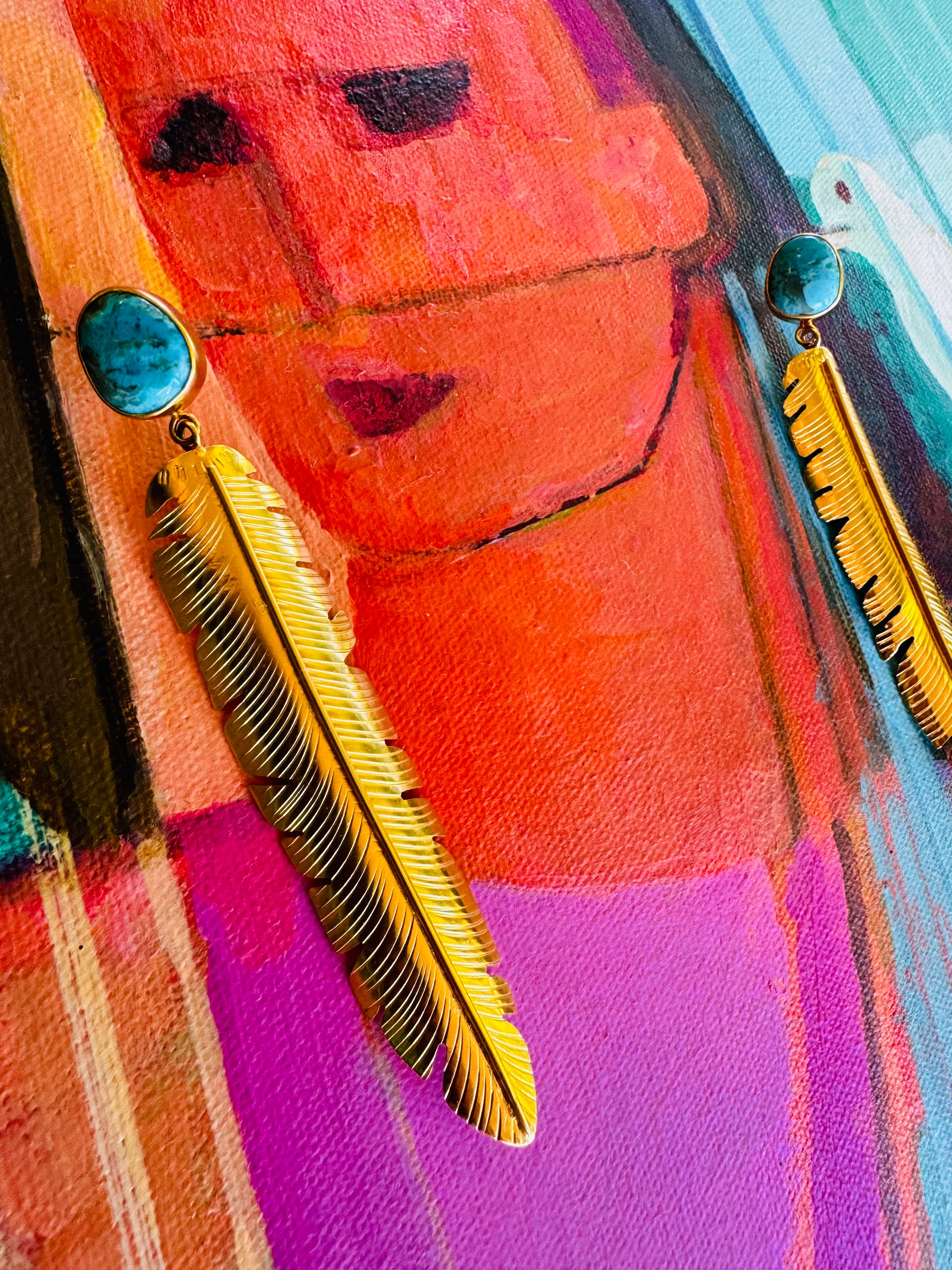 - Dangle into elegance with these charming feather earrings, featuring a striking blue Kingman turquoise stone and luxe 24K gold plating. Perfect for adding a touch of whimsy and natural beauty to any look, these statement pieces bring movement and personality to your everyday style.