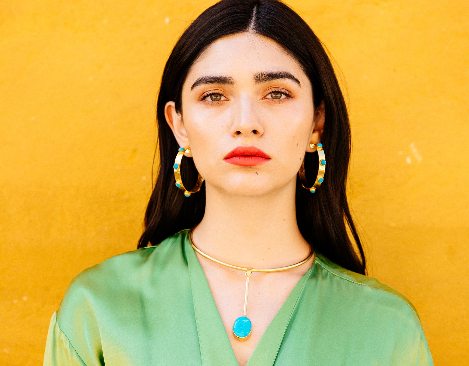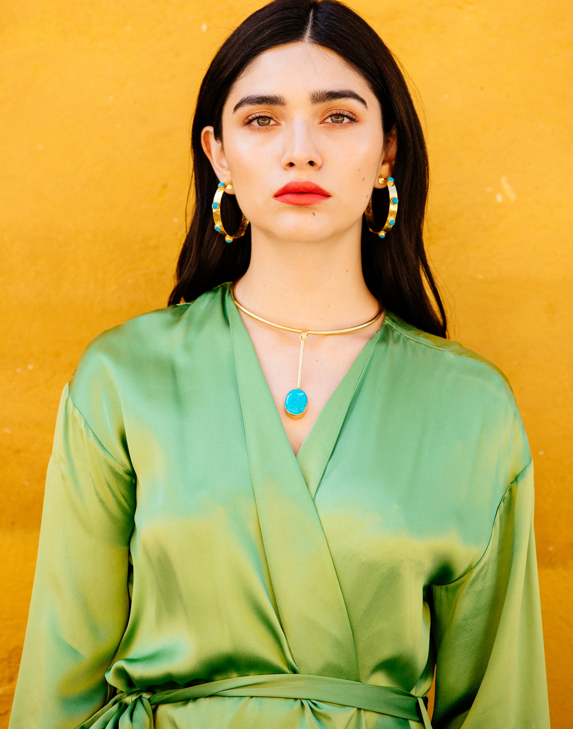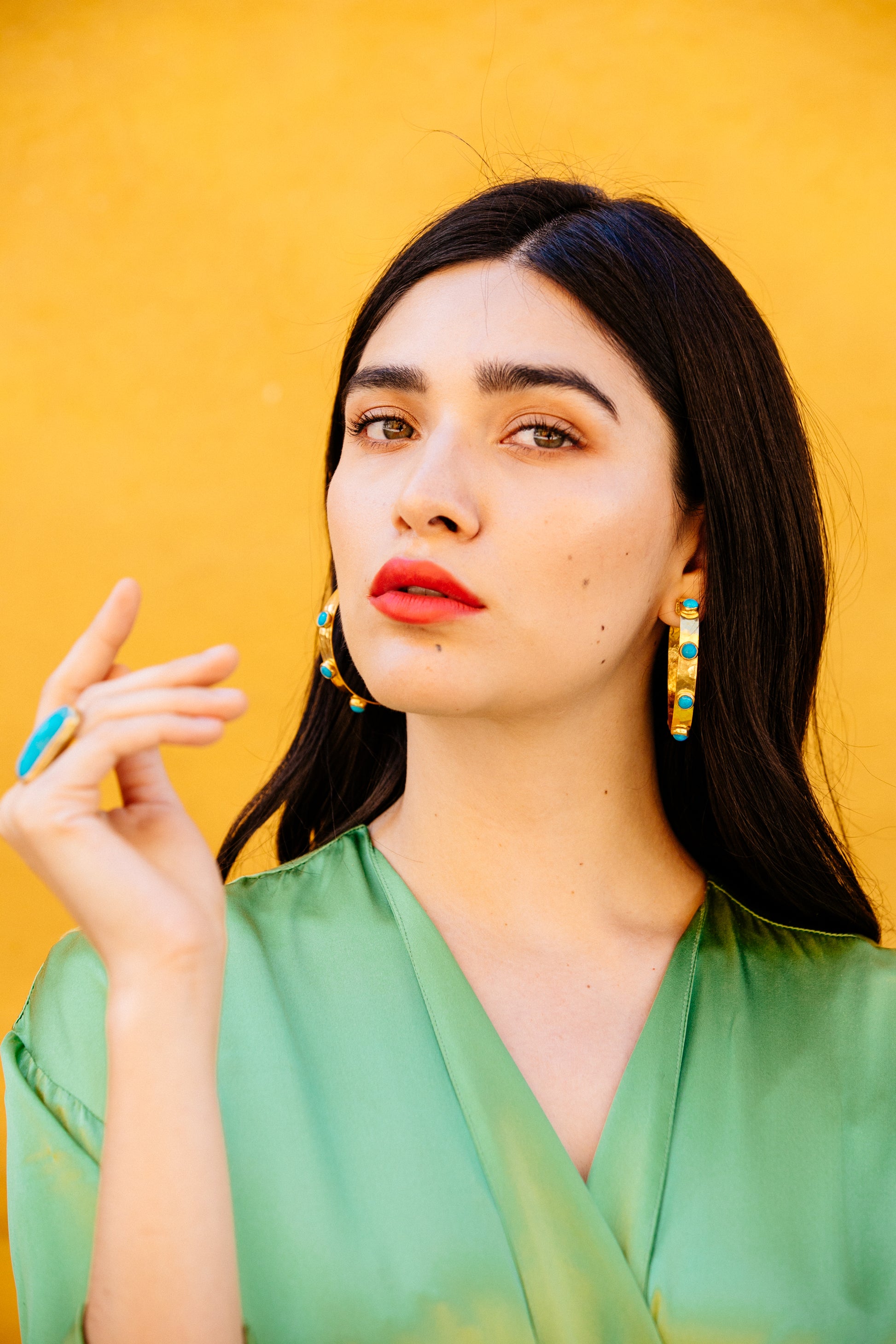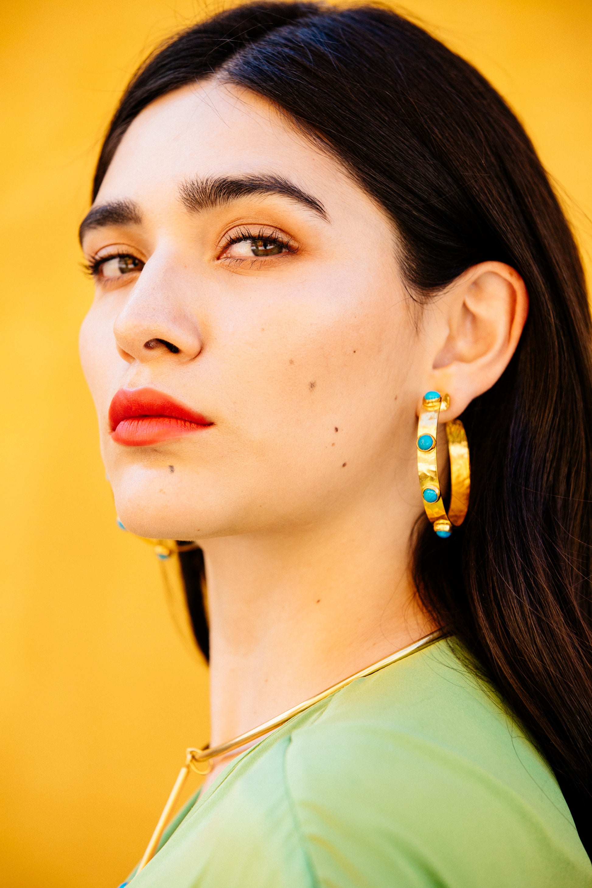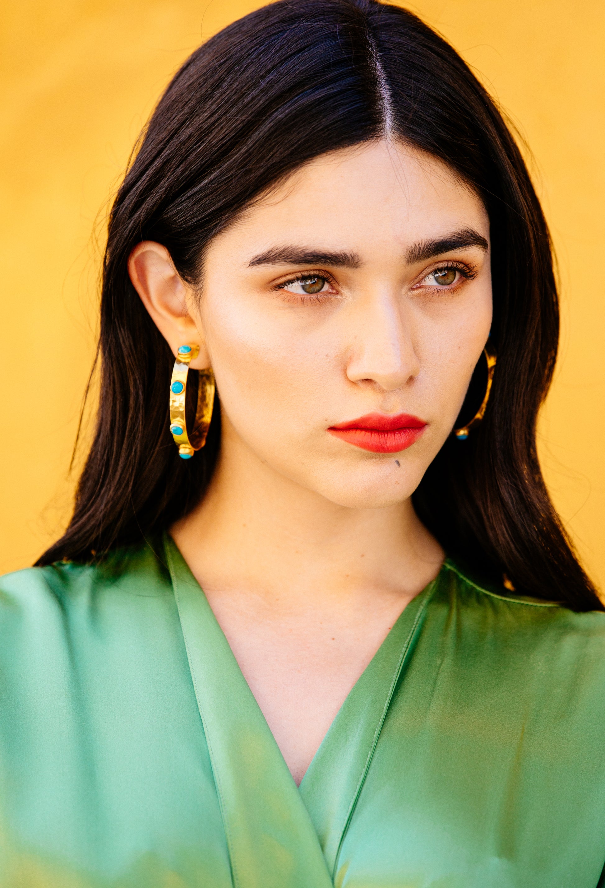 Our Large Hammered Hoop with Turquoise Stones makes a powerful statement-just like Angela herself. Strong-willed, fiery, and layered with emotional depth, this piece reflects the resilience and beauty of women navigating life’s wild terrain.