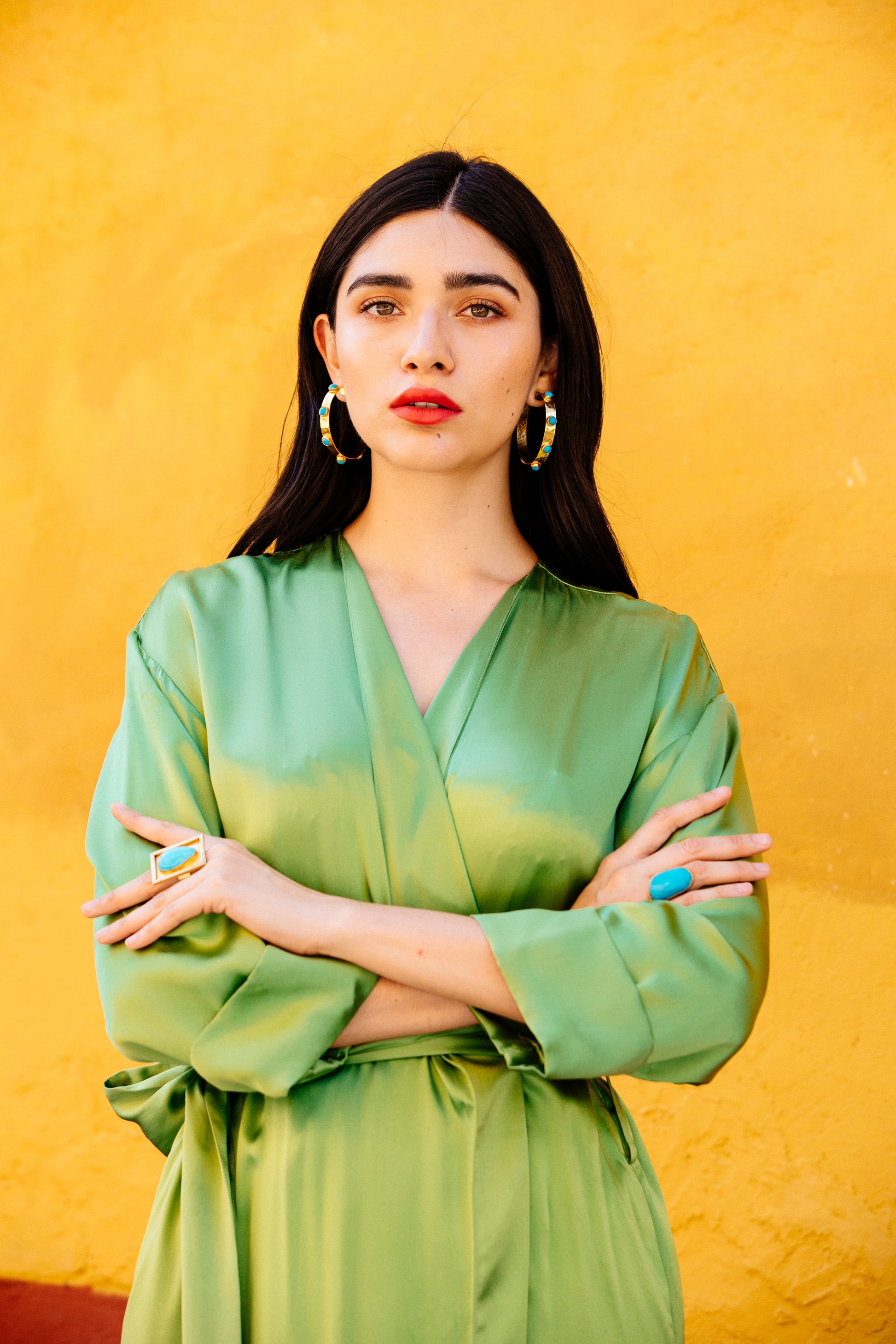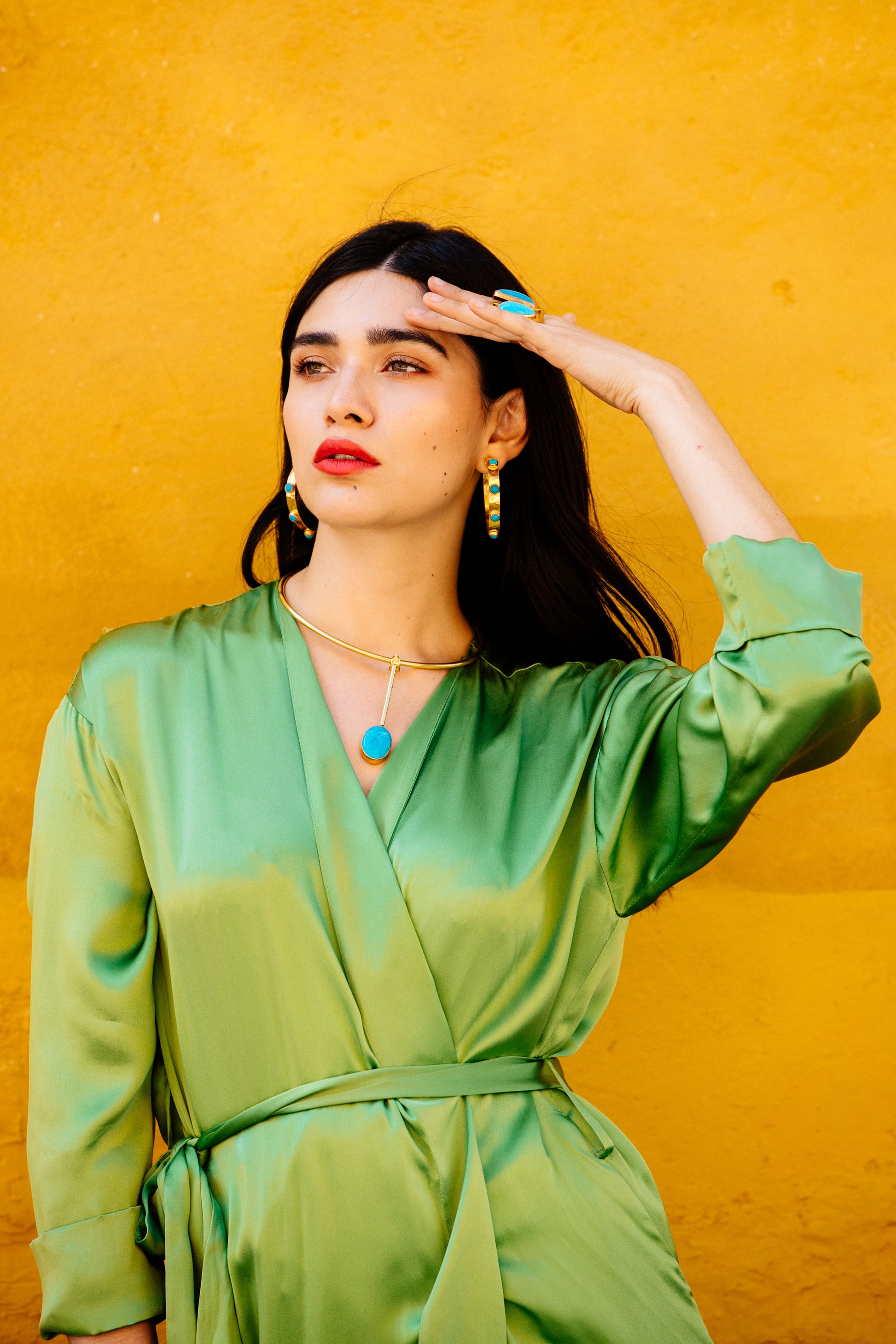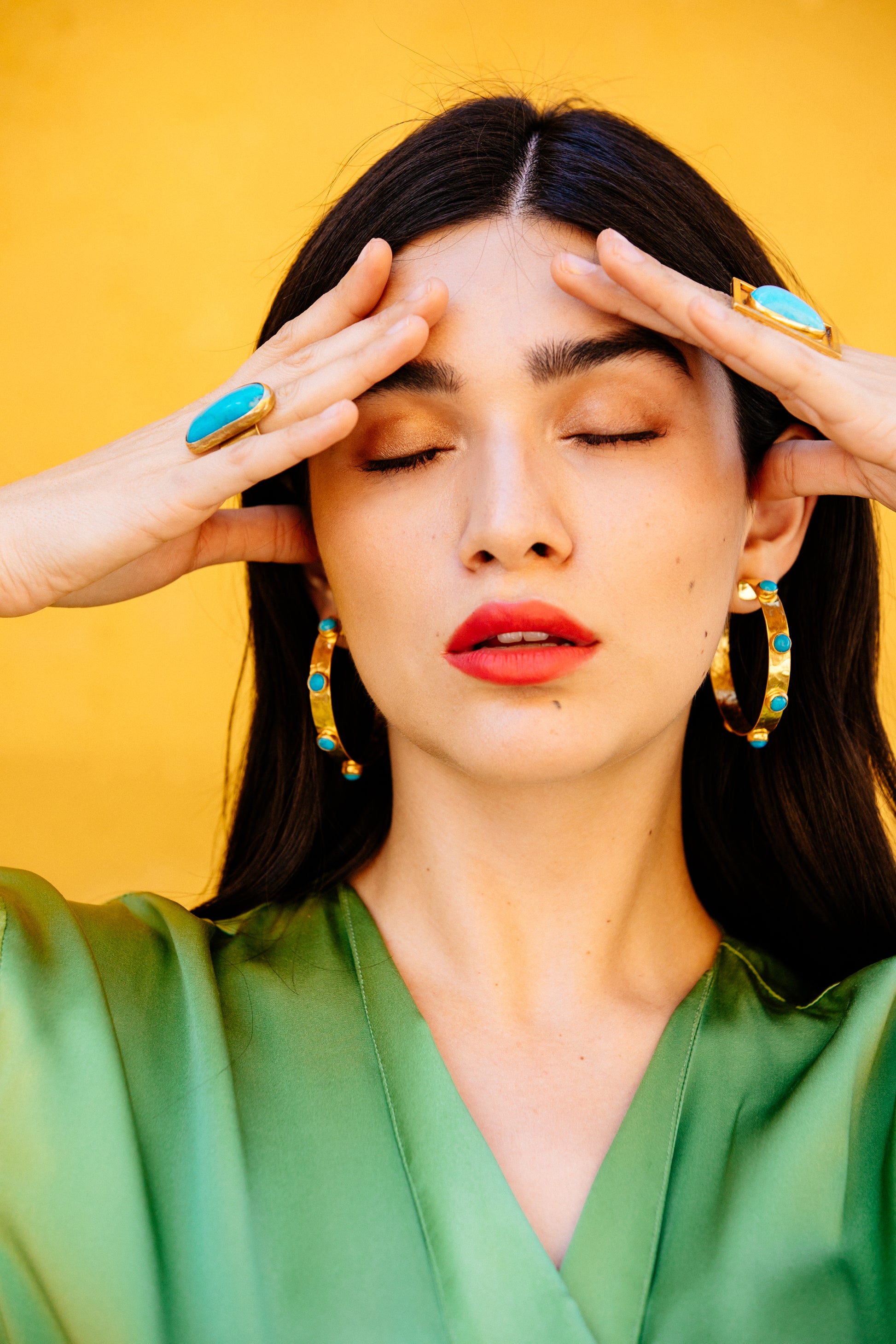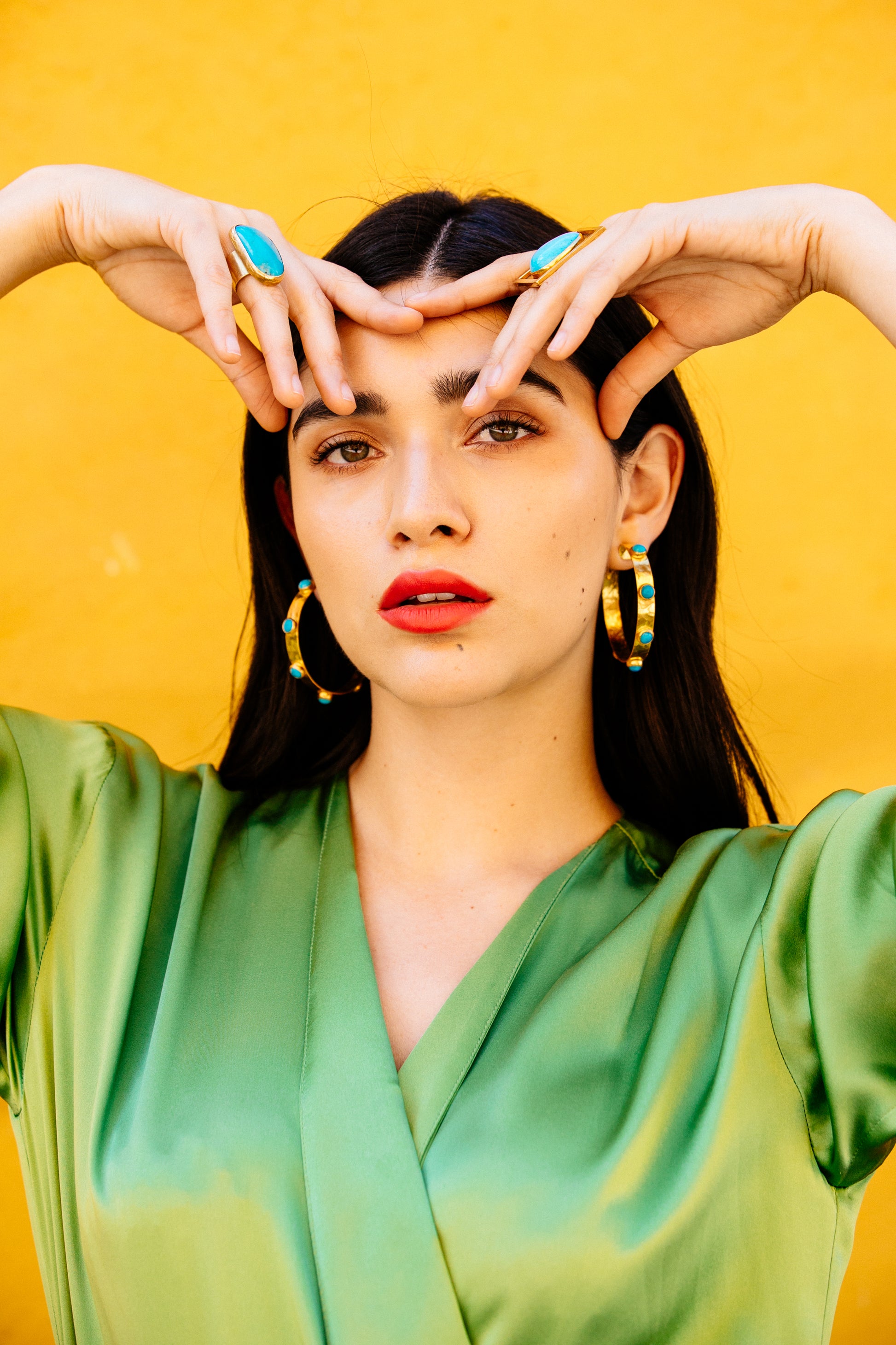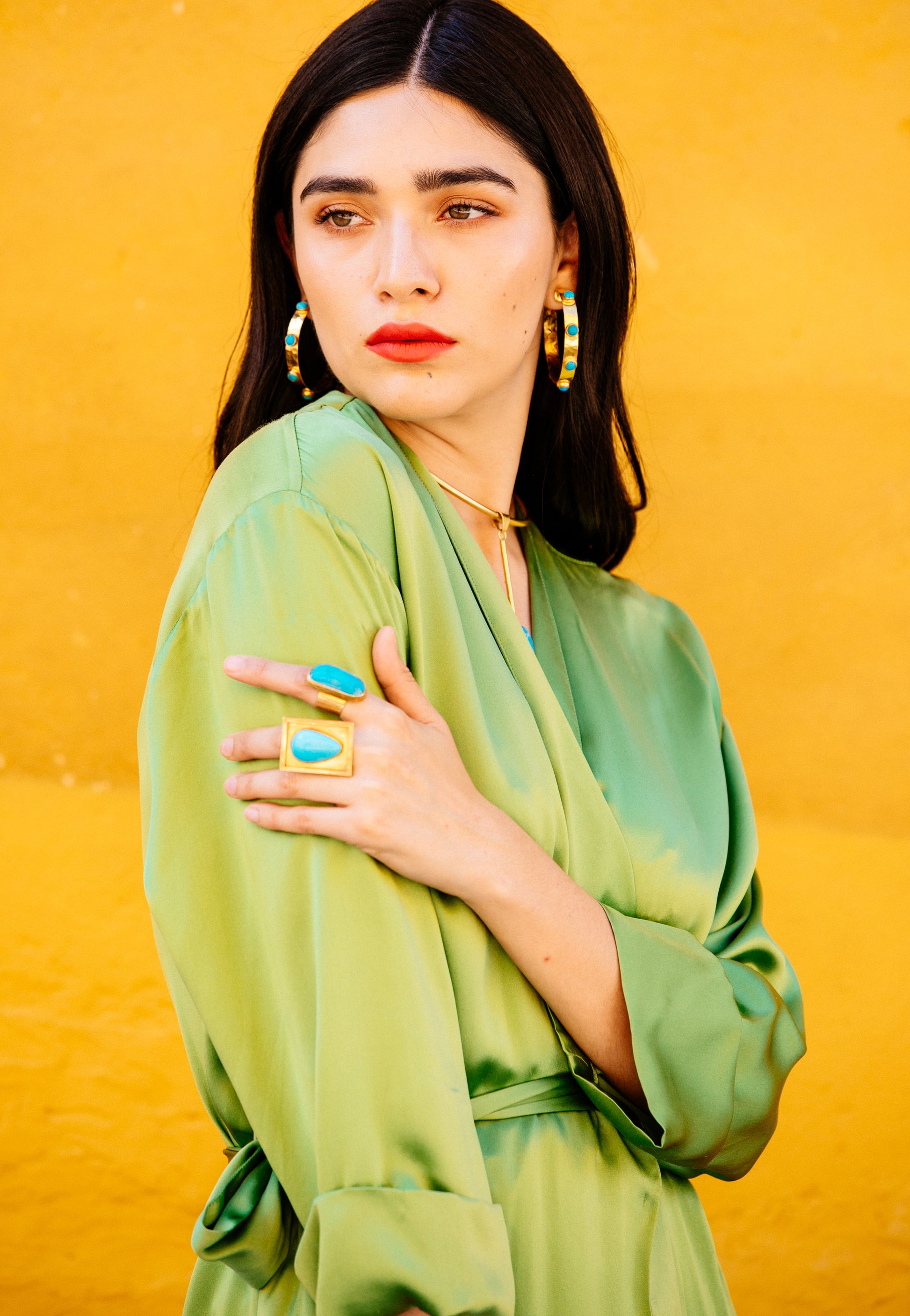 Our Large Hammered Hoop with Turquoise Stones makes a powerful statement-just like Angela herself. Strong-willed, fiery, and layered with emotional depth, this piece reflects the resilience and beauty of women navigating life’s wild terrain.