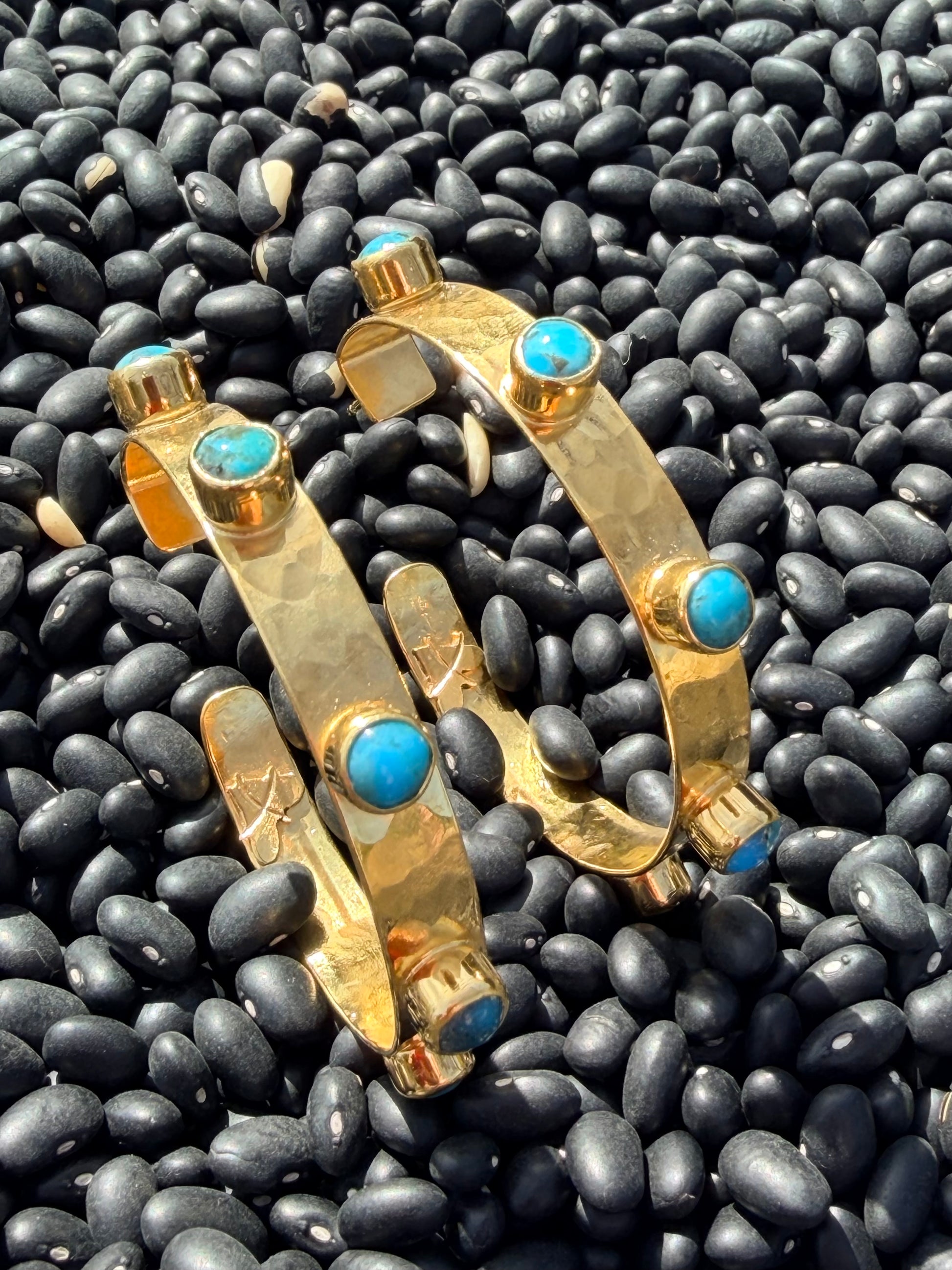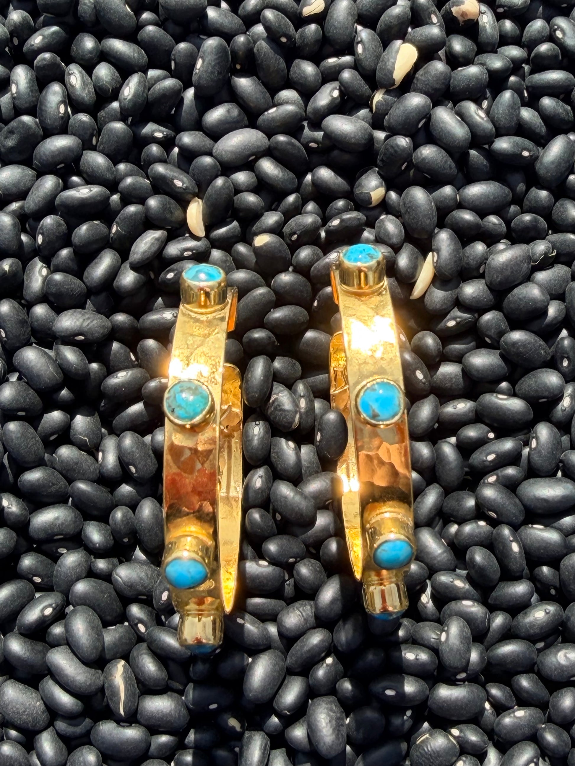 As seen on Landman, worn by the main character Angela. Large hammered hoop featuring 5 turquoise stones crafted in 24K gold-plated brass. Set with 7.5 carats (1.5 grams) of genuine Blue Kingman Turquoise. Dimensions: Hoop diameter 5.5 cm, hoop width 8 mm, stone size 5mm