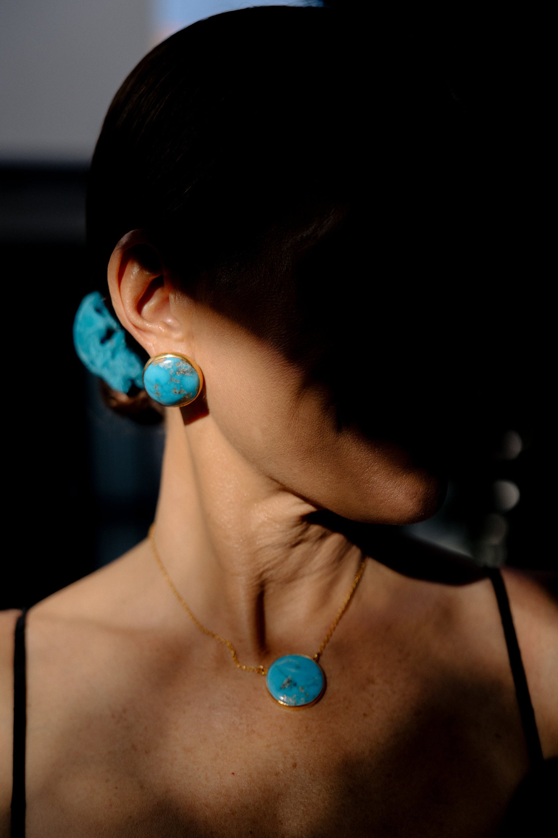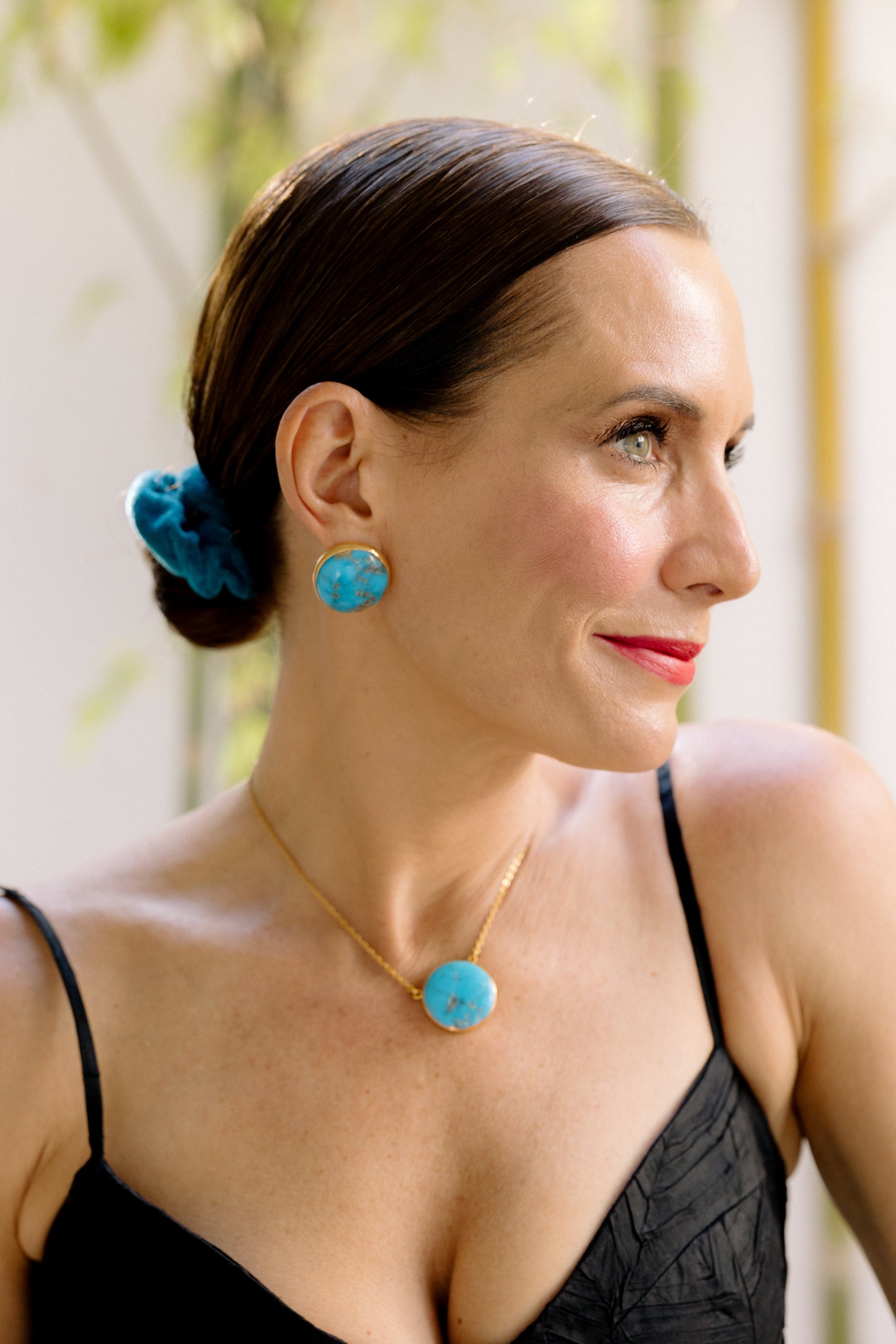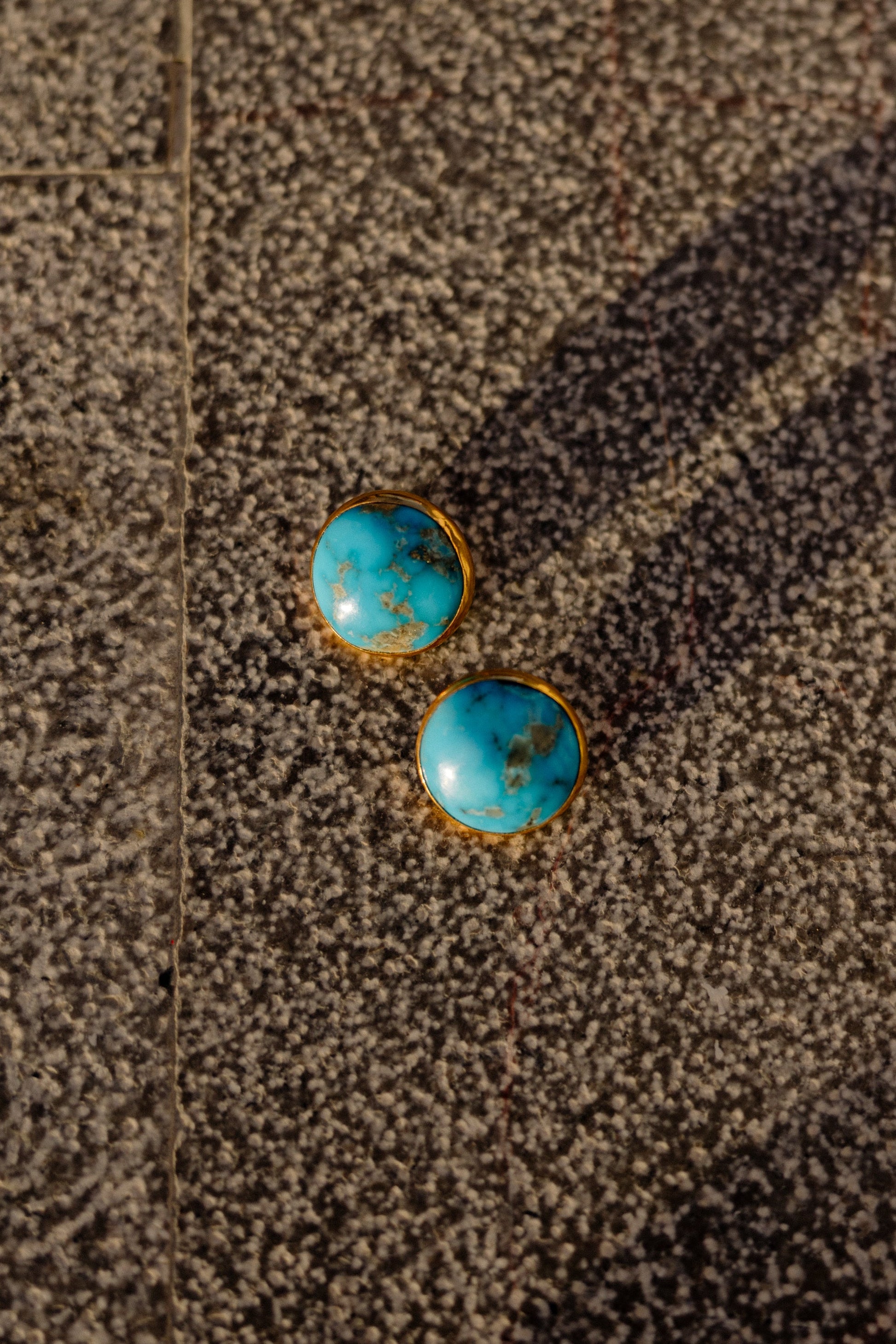Elevate your style with these Circle Stud Earrings featuring vibrant Kingman turquoise set in 24k gold-plated brass. Each earring measures 1 inch in circumference, offering a bold yet elegant statement perfect for any occasion.