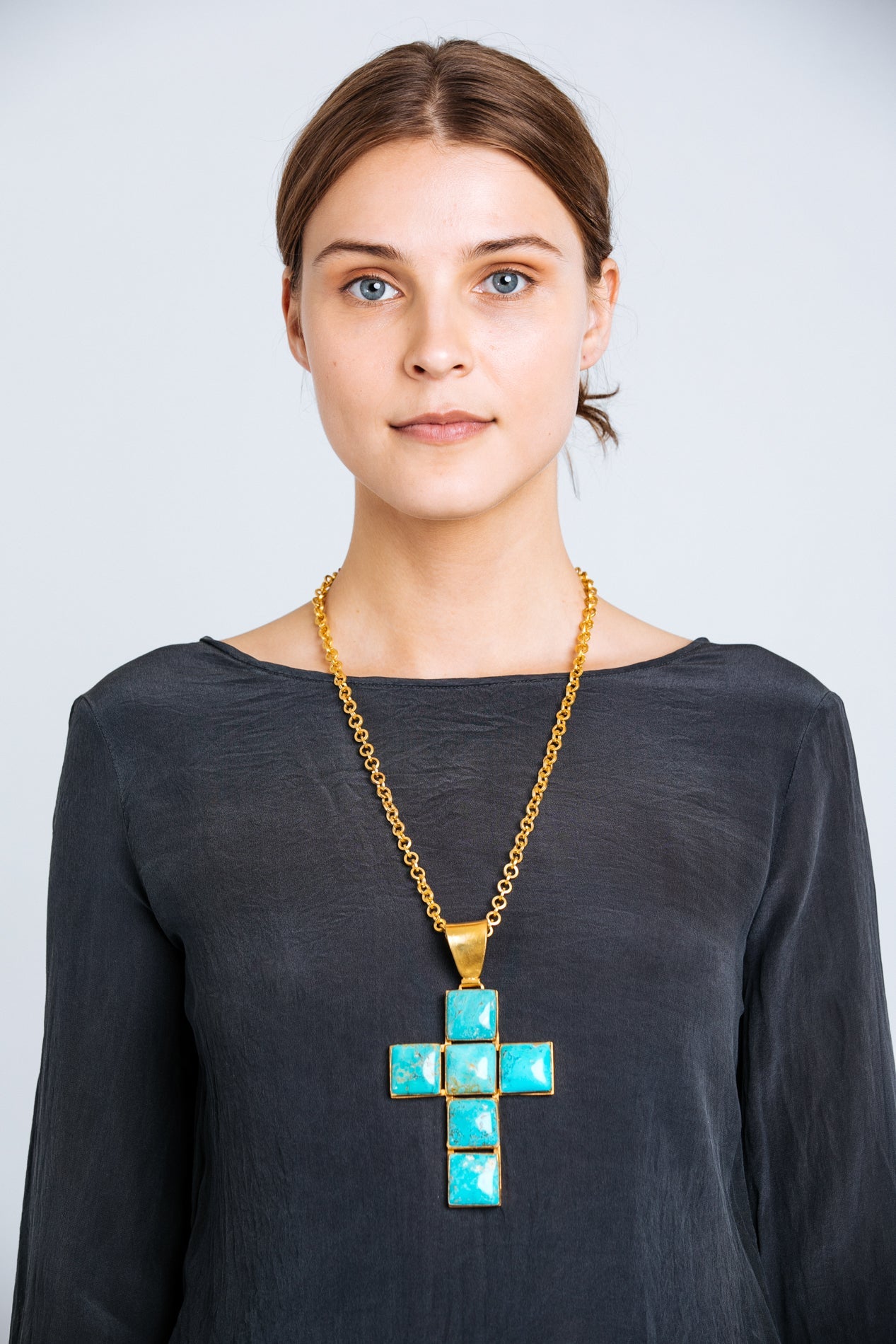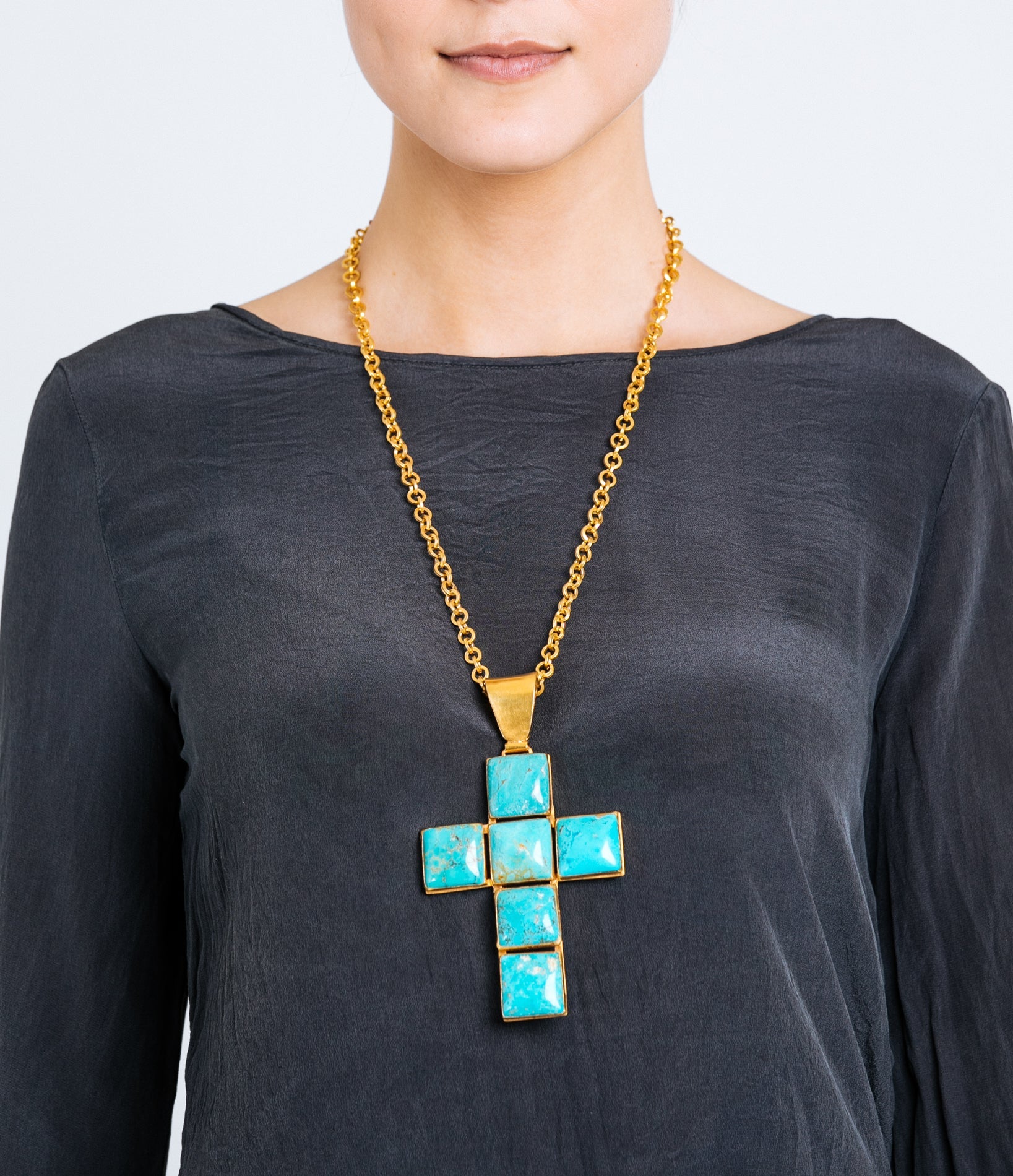 The Statement piece you have been waiting for...with style endurance for years to come. Blue Kingman Turquoise set in 24K Gold Plated Brass Dimensions: W:3in L:4in Chain: 32in