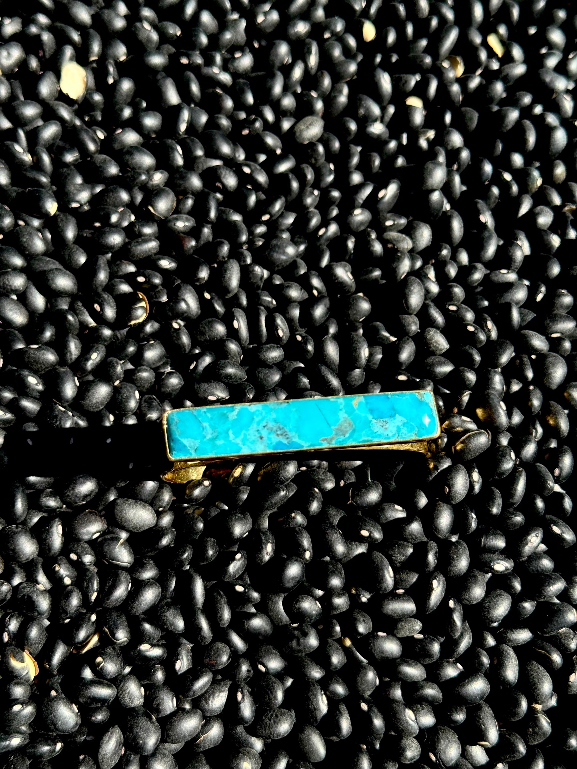 Discover the perfect stackable essential with the Bar Cuff! This geometric beauty showcases a stunning 1cm x 2-inch rectangle of vibrant Blue Kingman Turquoise set against a sleek 1cm-wide 24K gold-plated band. With its clean lines and southwestern charm, this playful piece sparkles with every movement and pairs beautifully with other favorites or shines solo. Add instant color and personality to your wrist with this mod-inspired must-have.