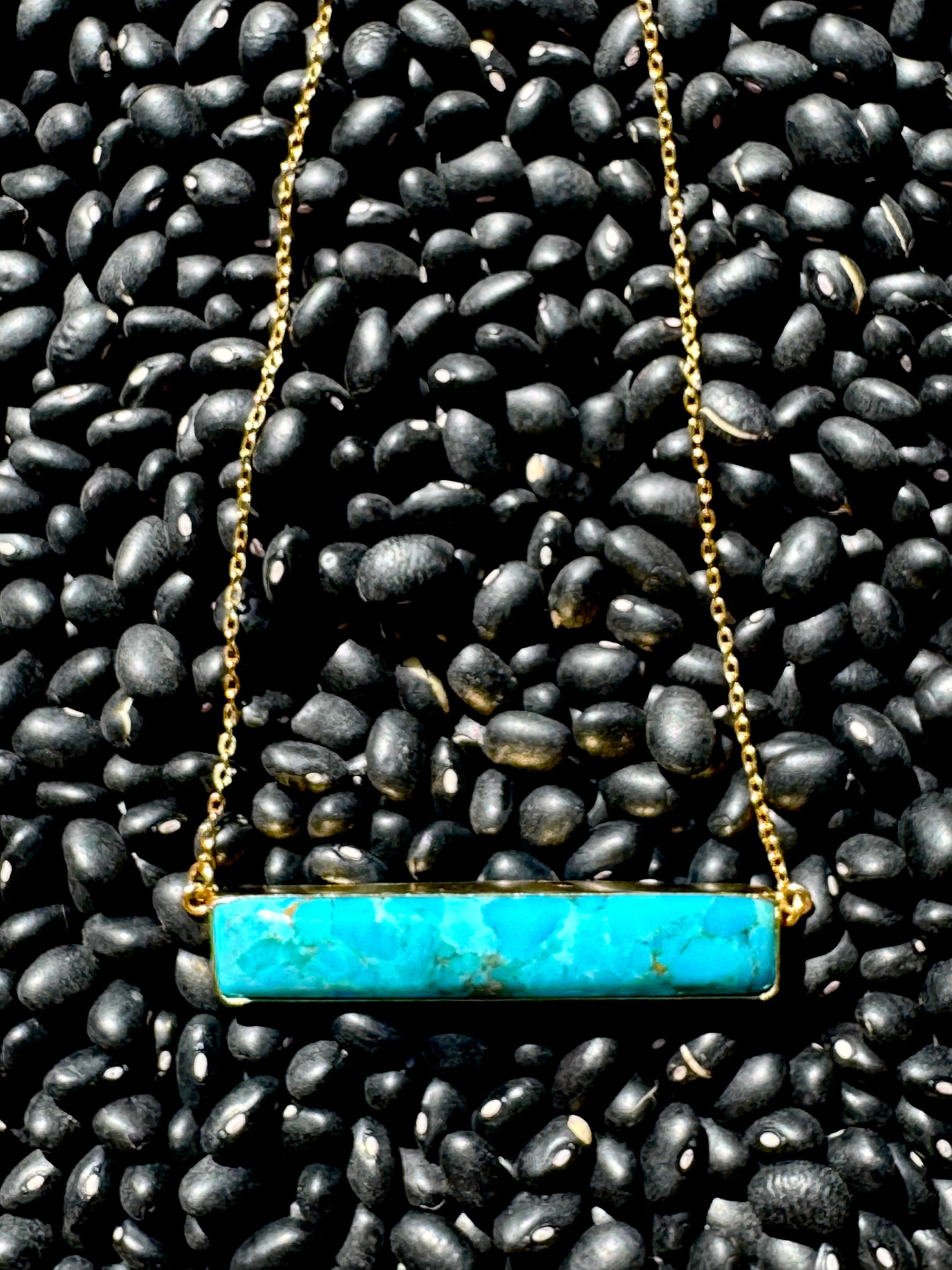 Make a statement with our best selling and eye-catching turquoise bar necklace that works beautifully on its own or layered with your favorites. Crafted from lustrous 24K gold-plated brass and adorned with striking Blue Kingman Turquoise, this piece brings vibrant color and geometric flair to any outfit. The petite rectangular stone measures 1cm by 2 inches, suspended from a graceful 16-inch chain that hits just right. Perfect for mixing, matching, and making your necklace game unforgettable.