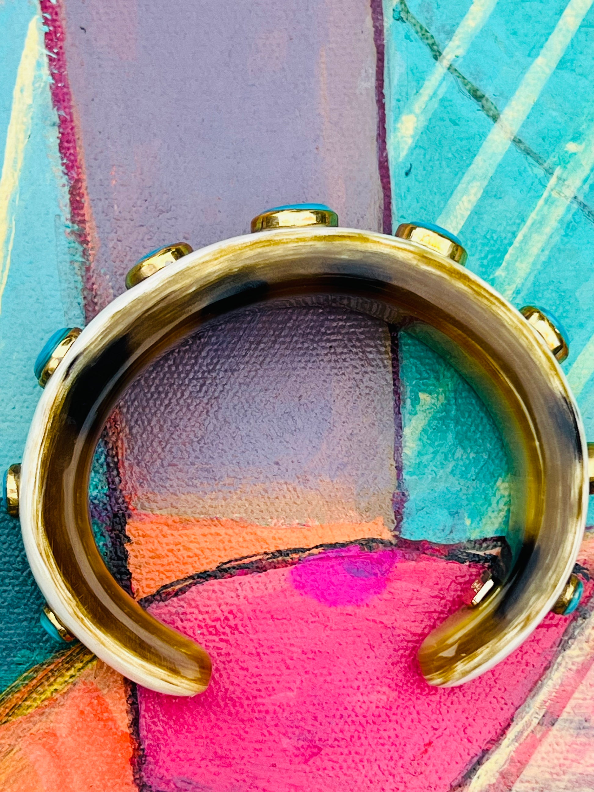 - 9 Turquoise-colored horn cabochons in brass bezel settings and studded onto a natural-colored horn cuff