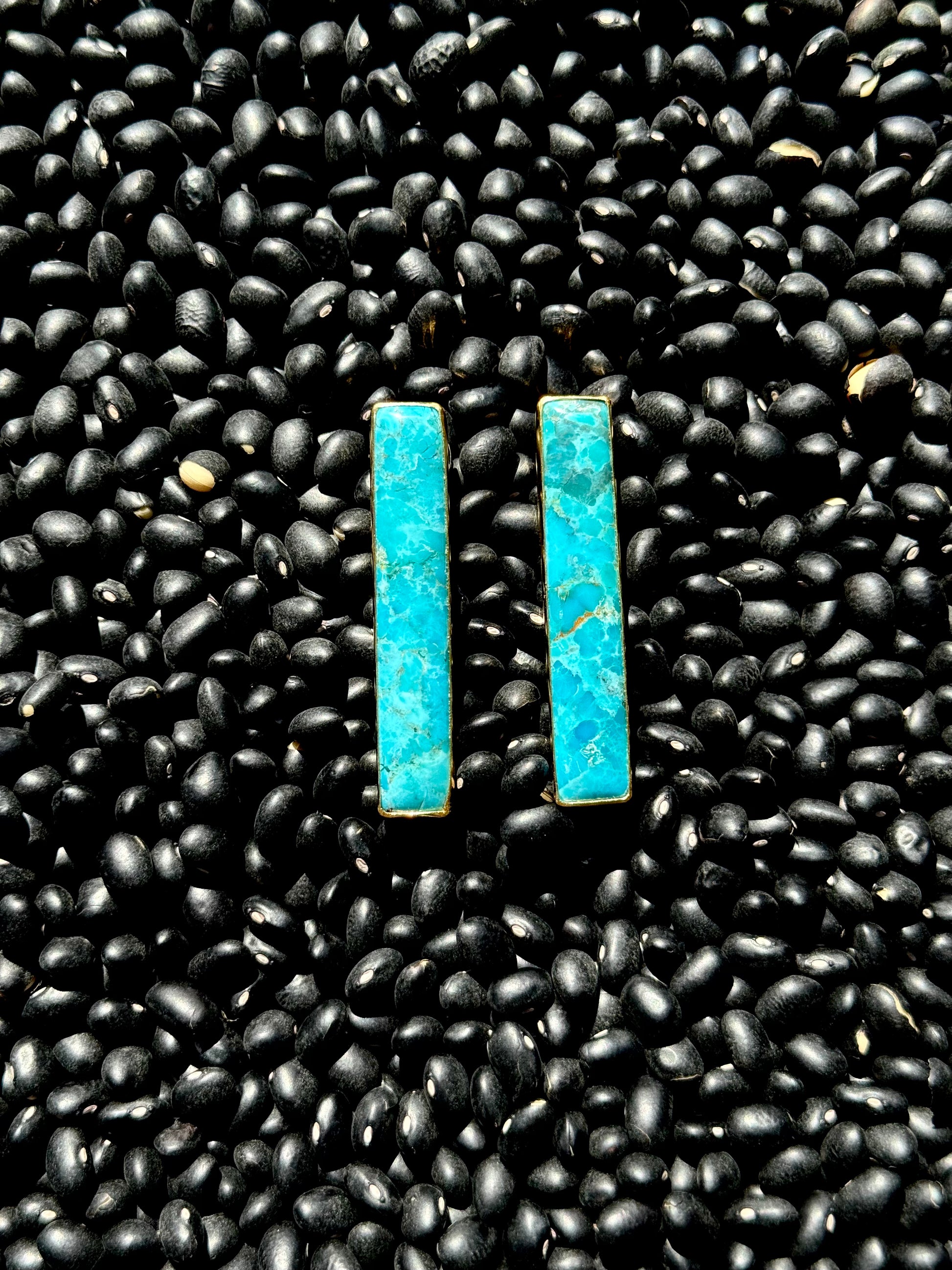 Turn heads with these bold turquoise statement earrings that deliver serious style in a compact design. Showcasing stunning Blue Kingman Turquoise nestled in radiant 24K gold-plated brass, these rectangular bars are your new go-to for adding vibrant flair to any outfit. At just 1cm wide and 2 inches tall, they're the perfect balance of presence and wearability. Stack them with your other favorites or let them shine solo—either way, you'll be making a colorful impression.